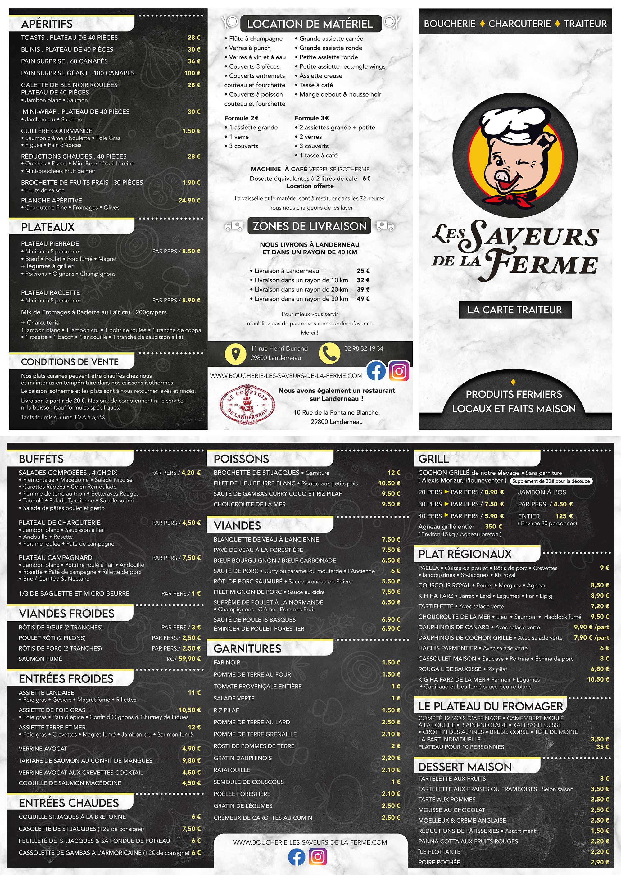 Boucherie-Traiteur dans le Finistère, Les Saveurs de la ferme vous accueille à Landerneau, où vous pourrez y découvrir tous les bons produits de la région. Avec notre service traiteur, offrez un service de qualité à tous vos invités.